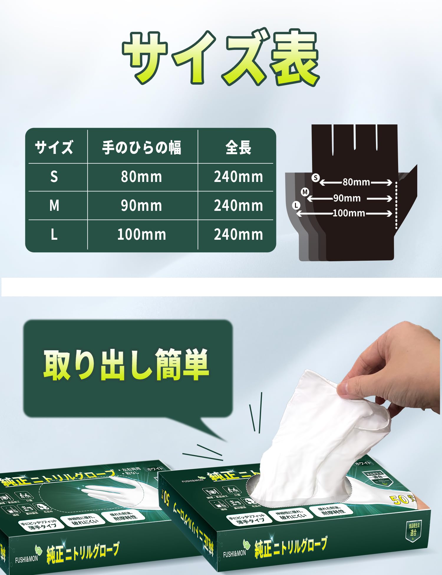 [FUSHI&MON] ニトリル手袋 ゴム手袋 ニトリルグローブ ビニール手袋 使い捨て手袋【食品衛生法適合】 粉なし 作業用 調理用 防護 パウダーフリー 100枚 S