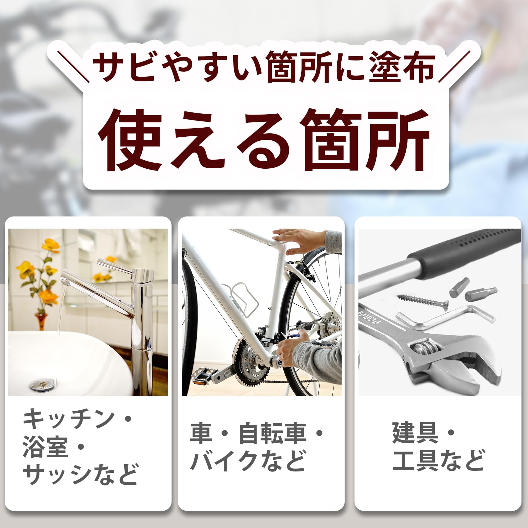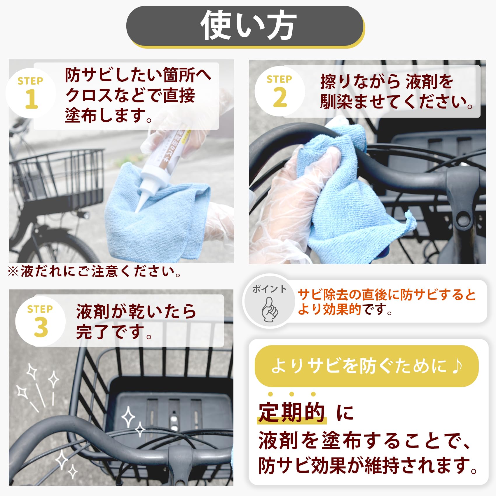 * 防サビしたい箇所へ塗布し、馴染むように液剤を擦り込んでください。液剤が乾くと膜を貼りサビを抑制します。