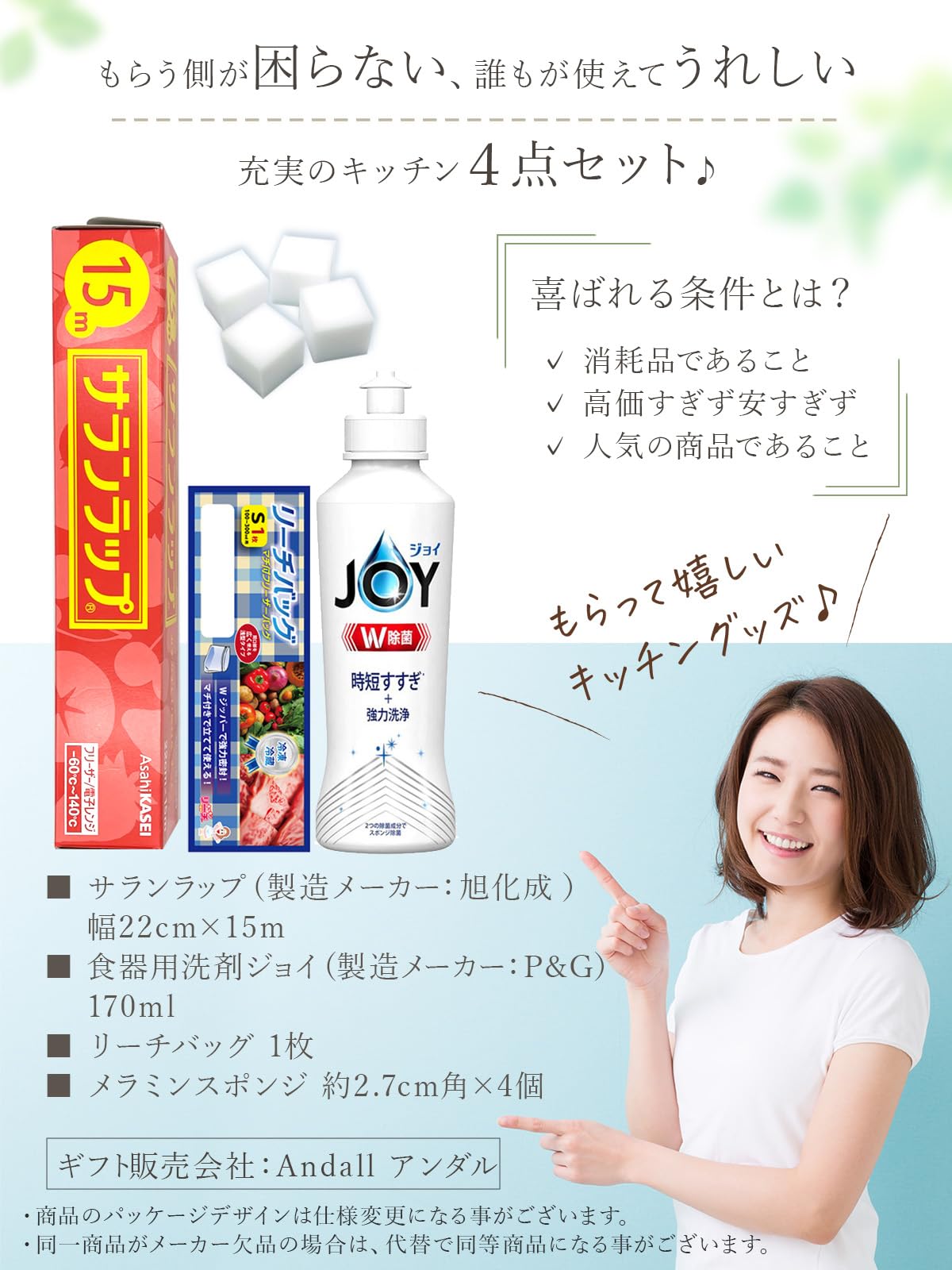 * 【中身は安心の有名ブランド】 中身は貰ったお相手が困らない、キッチングッズの消耗品4点セット性別・年齢にも左右されない、誰もが知っている有名ブランド商品を一つ一つ厳選してチョイスしております。旭化成社製の食品ラップやP&G社製の食器用洗剤ジョイなど、各分野で高シェアを誇る商品をセットにしています。