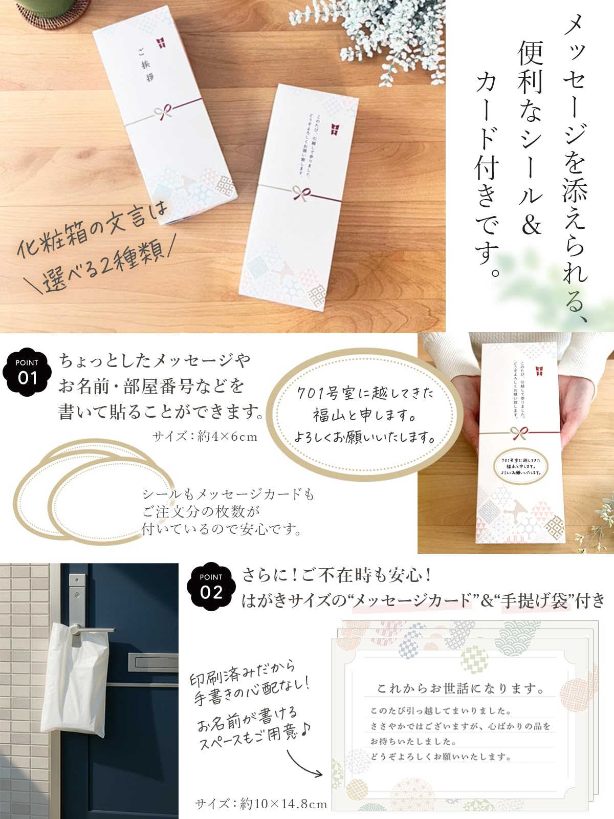 * 【手提げ袋付きで持ち運びも安心】 お客様の声にお応えし、手提げ袋をセットにいたしました。別途ご用意いただく必要がなく、そのまま持参できるのでご挨拶回りもスムーズです。
