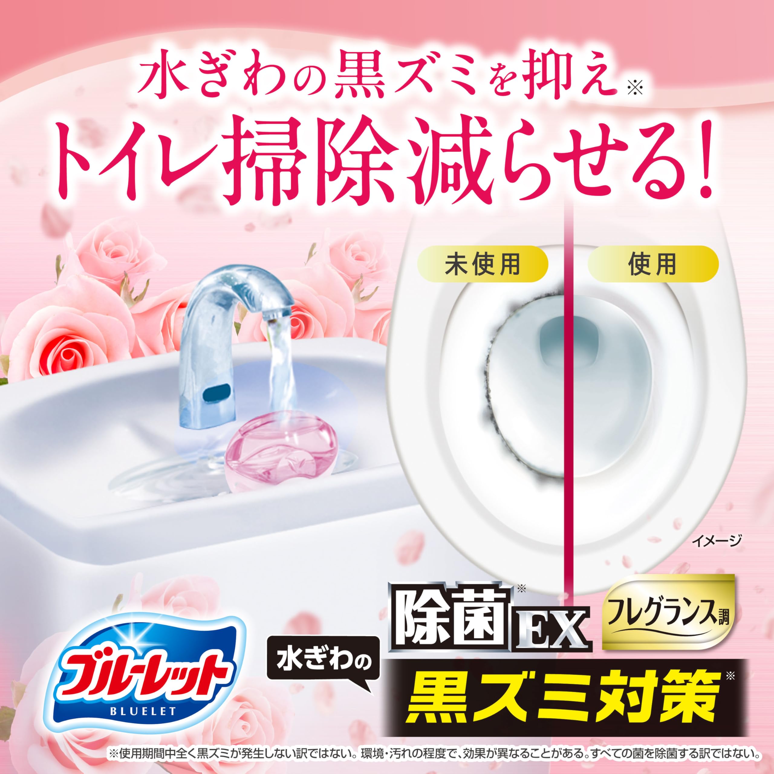 * 除菌率99%*1で、水ぎわの黒ズミの発生を抑え*2、トイレ掃除を減らせます。*1 水ぎわの黒ズミ原因菌への効果。全ての菌を除菌する訳ではない。当社の実験室内の検証結果による。*2 使用期間中、まったく黒ズミが発生しない訳ではない。