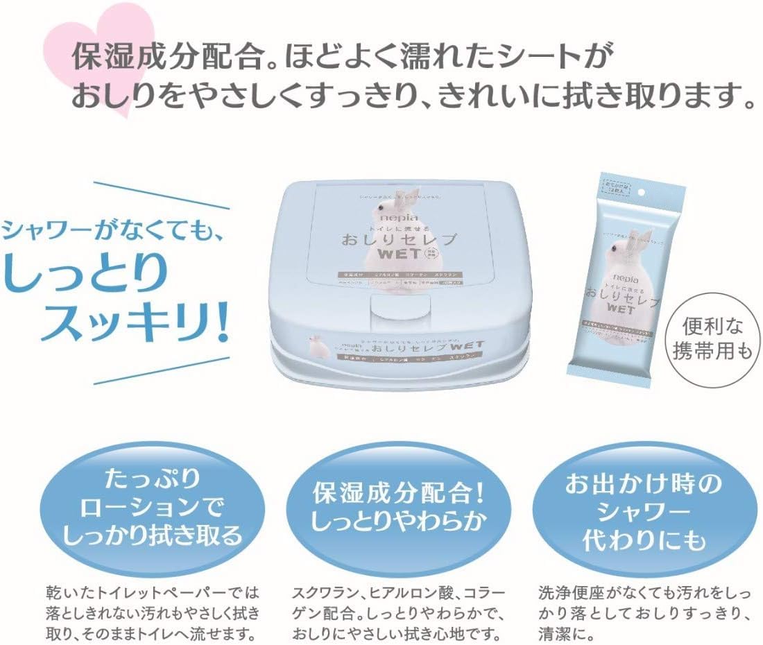 * シャワーがなくてもしっとりスッキリ。トイレに流せるおしりの洗浄シート。