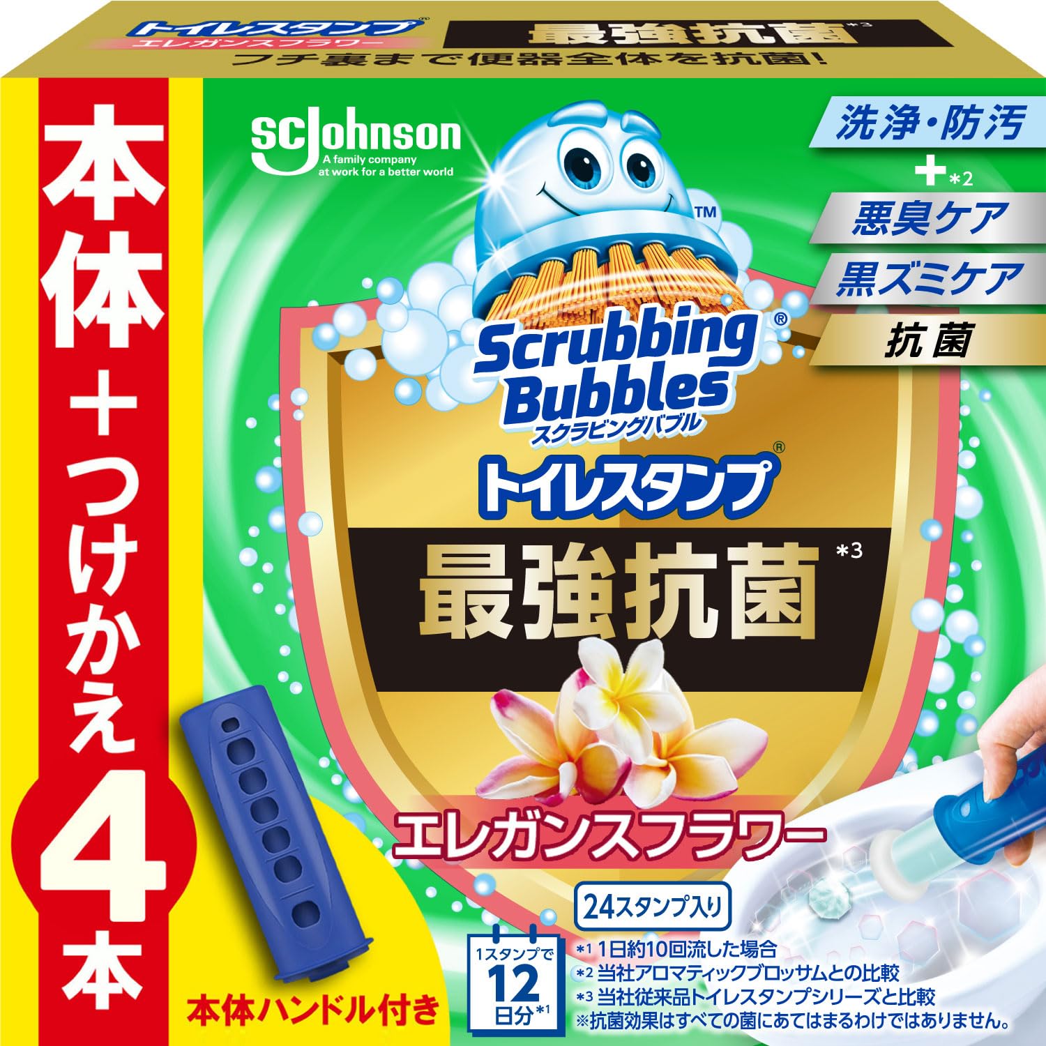 スクラビングバブル (Scrubbing Bubbles) トイレ掃除 トイレスタンプ 最強 抗菌 エレガンスフラワーの香り 本体ハンドル+詰め替え用 4本(24スタンプ分) 洗剤 洗浄剤 掃除 付け替え用 まとめ買い