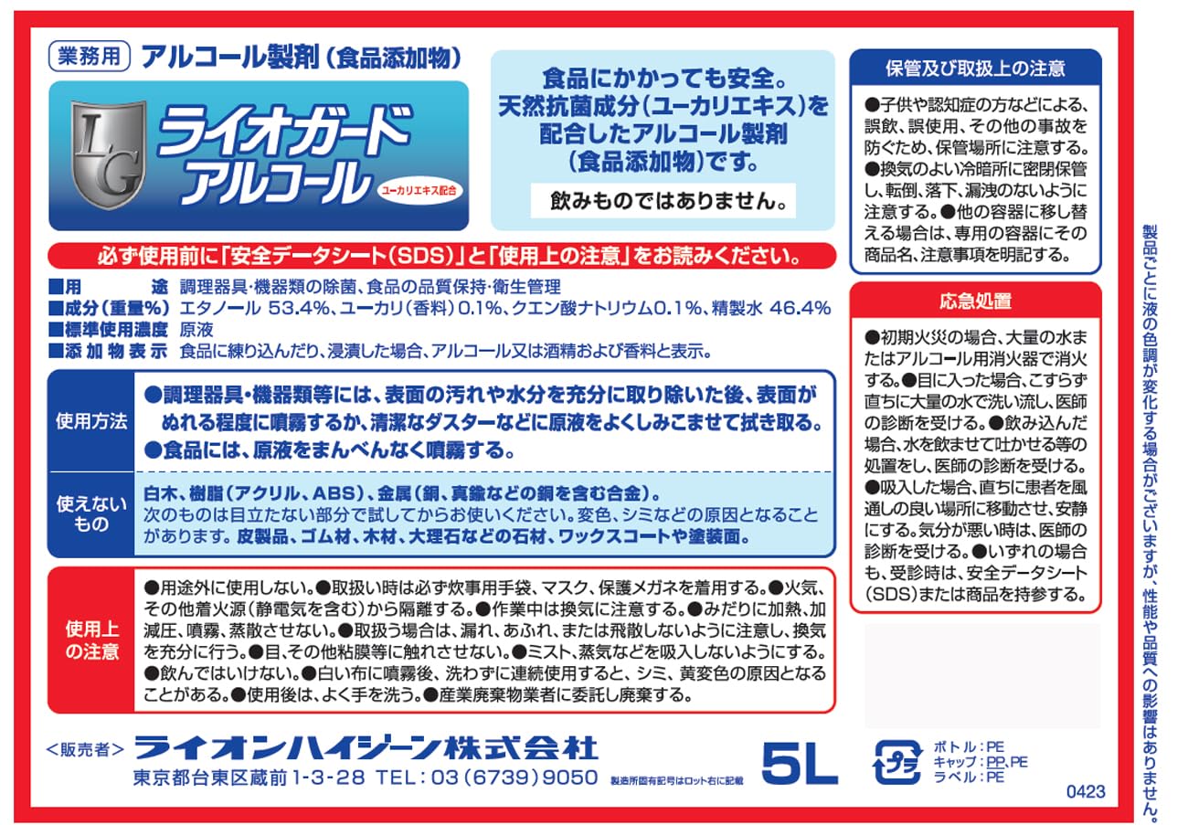 【業務用 大容量】 ライオン ( LION ) ライオガード アルコール 5L 61% 食品添加物 ふきん付 アルコール除菌 アルコール消毒液 詰め替え