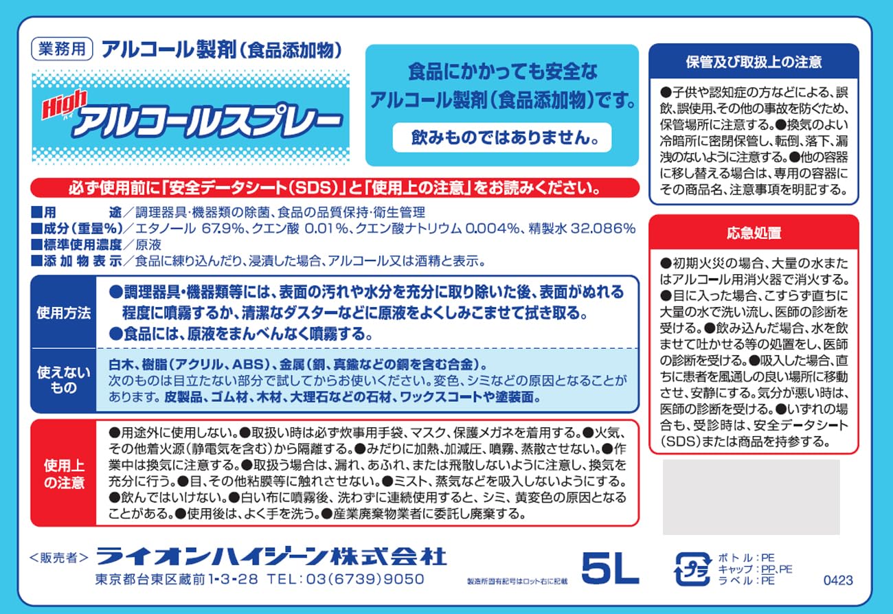 ライオン (LION) ハイアルコールスプレー5L 75% 食添 ふきん付 【業務用 大容量】アルコール アルコール除菌 アルコール消毒液 詰め替え 高濃度