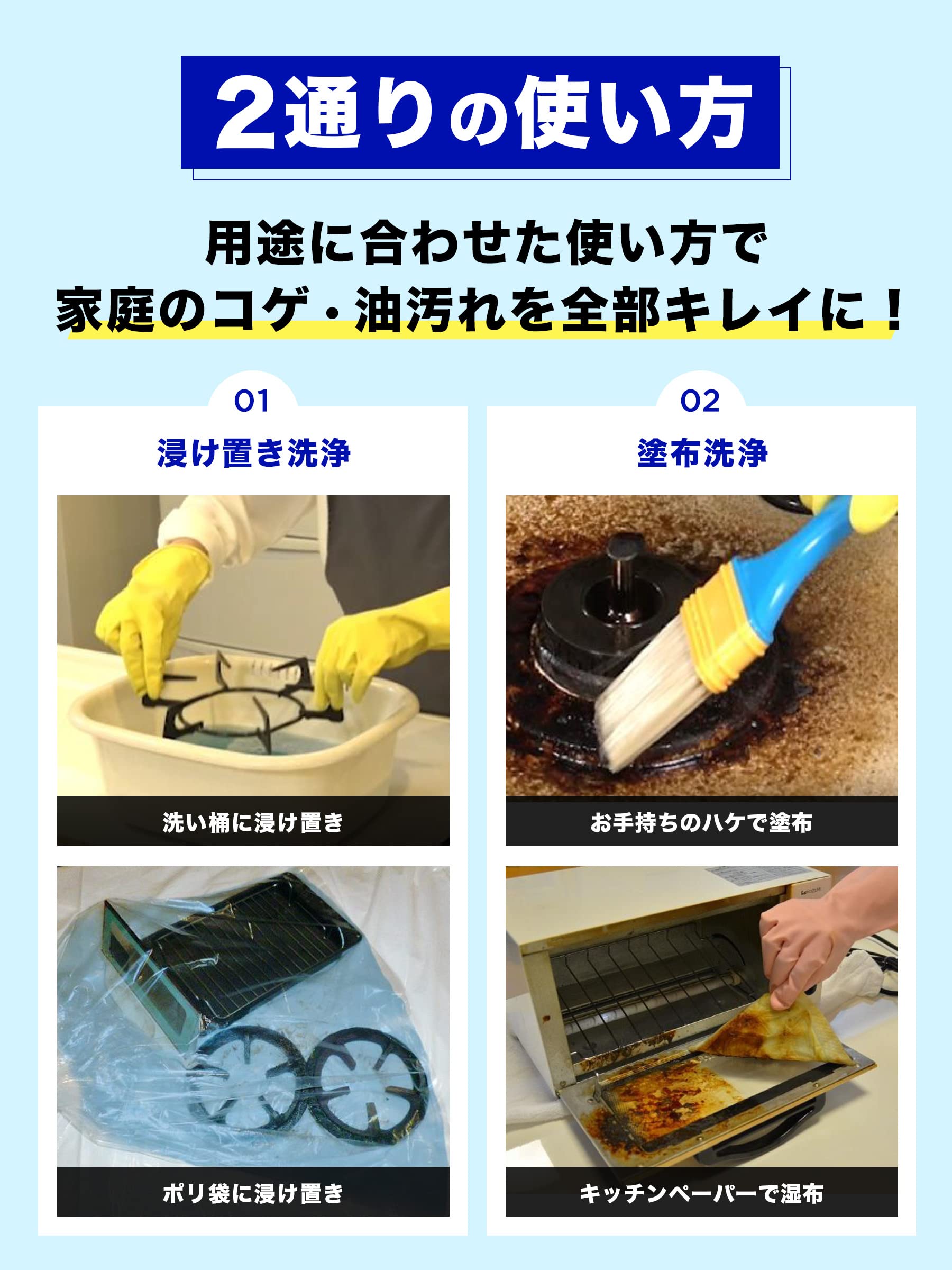 * 【塗布洗浄】コンロまわり、レンジ・オーブンまわりなど:ハケやキッチンペーパーなどに液を含ませ、汚れに塗って5分ほどおき、水洗いするか水ぶきで洗剤分を取り除きます。【つけおき洗浄】調理器具・五徳・換気扇など:ポリ袋や洗い桶に入れた液につけて15分ほどおき、水で十分にすすぎます。※シンクの中で作業してください。