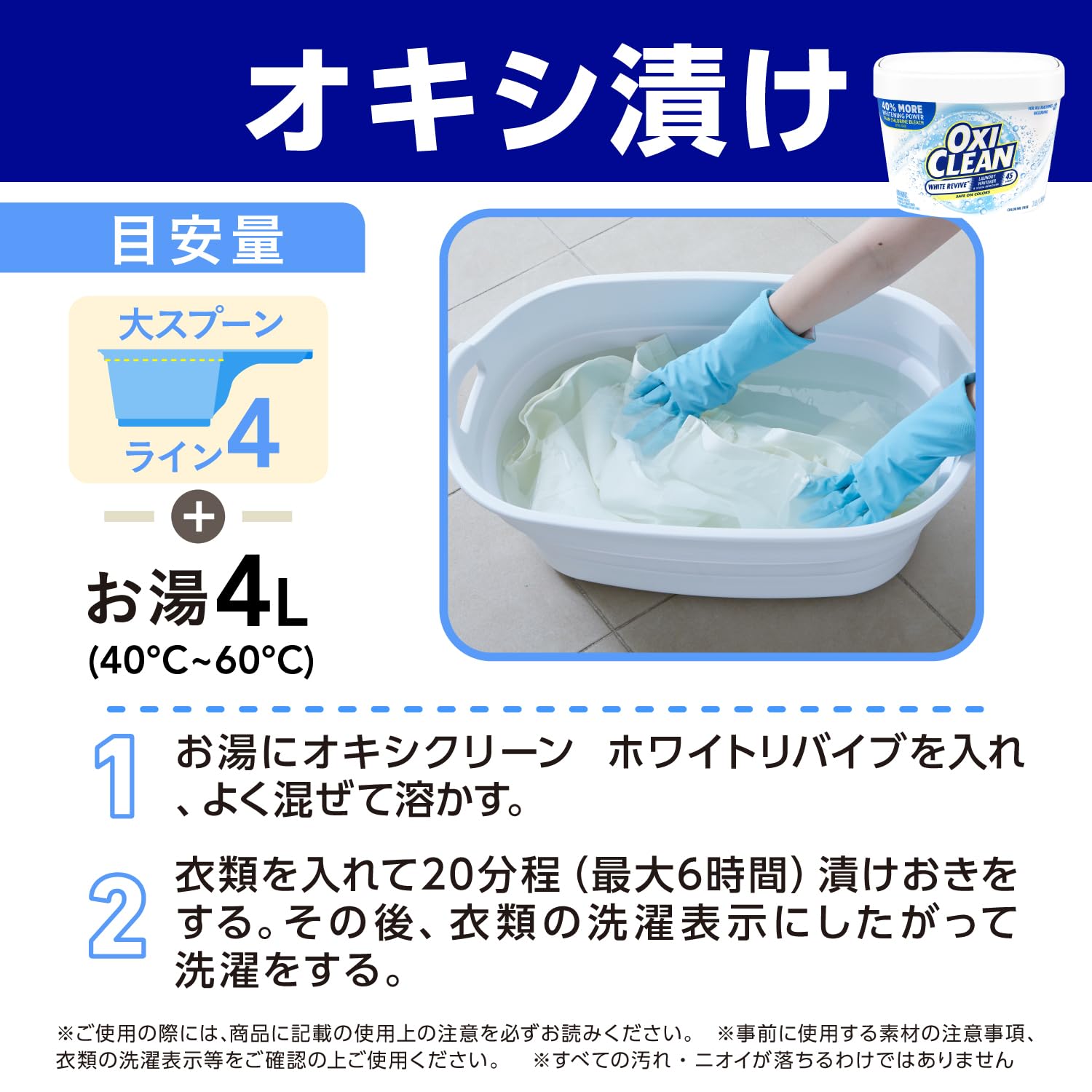 * ※洗濯量が多い場合やより白くしたい場合は、オキシクリーンの量を増やします。 ※洗濯表示の上限温度になるべく近い温度のお湯のご使用をおすすめします。