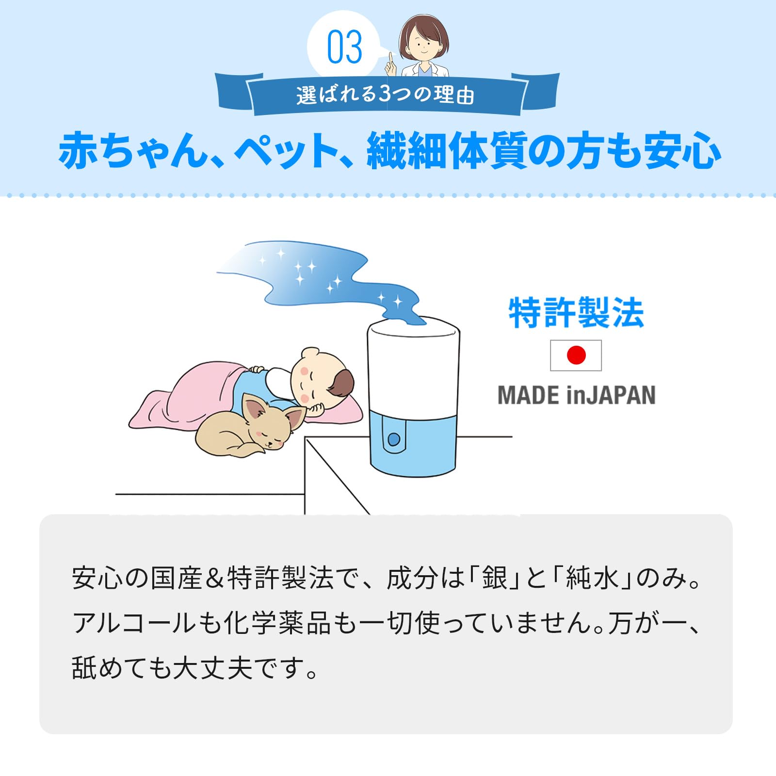 * 【化学薬品無添加】成分は純銀、純水のみ。界面活性剤やエタノール等、化学薬品は一切使っていないので繊細さんも安心!