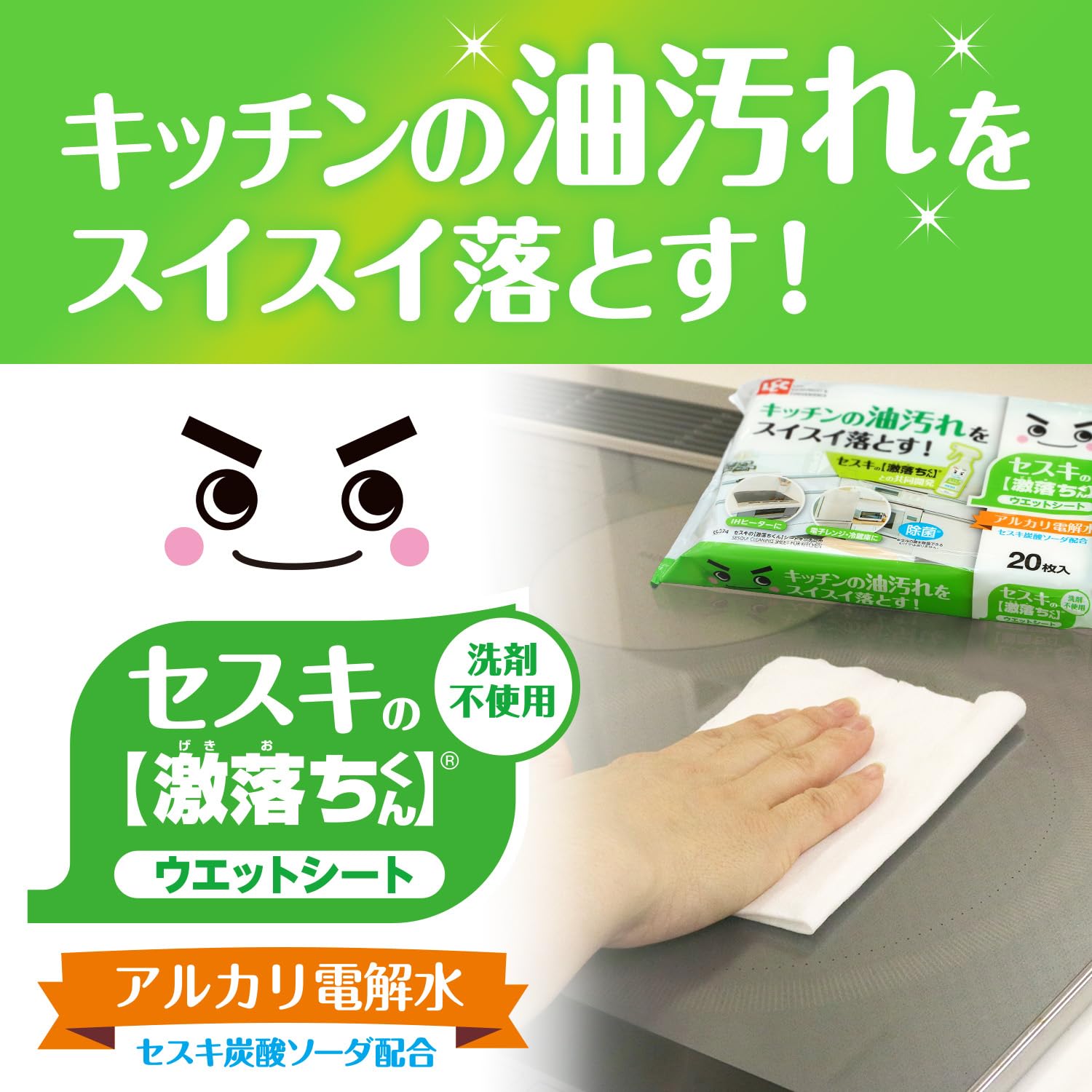* セスキ炭酸ソーダとアルカリ電解水配合で、キッチンの油汚れをスイスイ落とします。