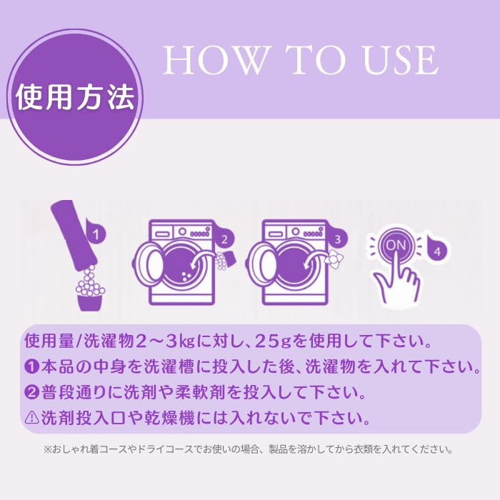 * ・節水モードなど利用しない ・洗濯物の量を詰め込む等の場合、ビーズは最初に投入し、溶けやすくする。また、すすぎを2度利用いただく。 ・洗濯物の量が多い場合で最後に投入すると、洗濯物の隙間に入って溶け切らない場合があります。