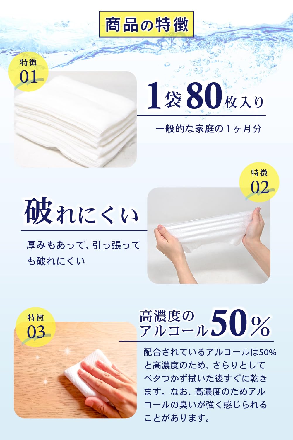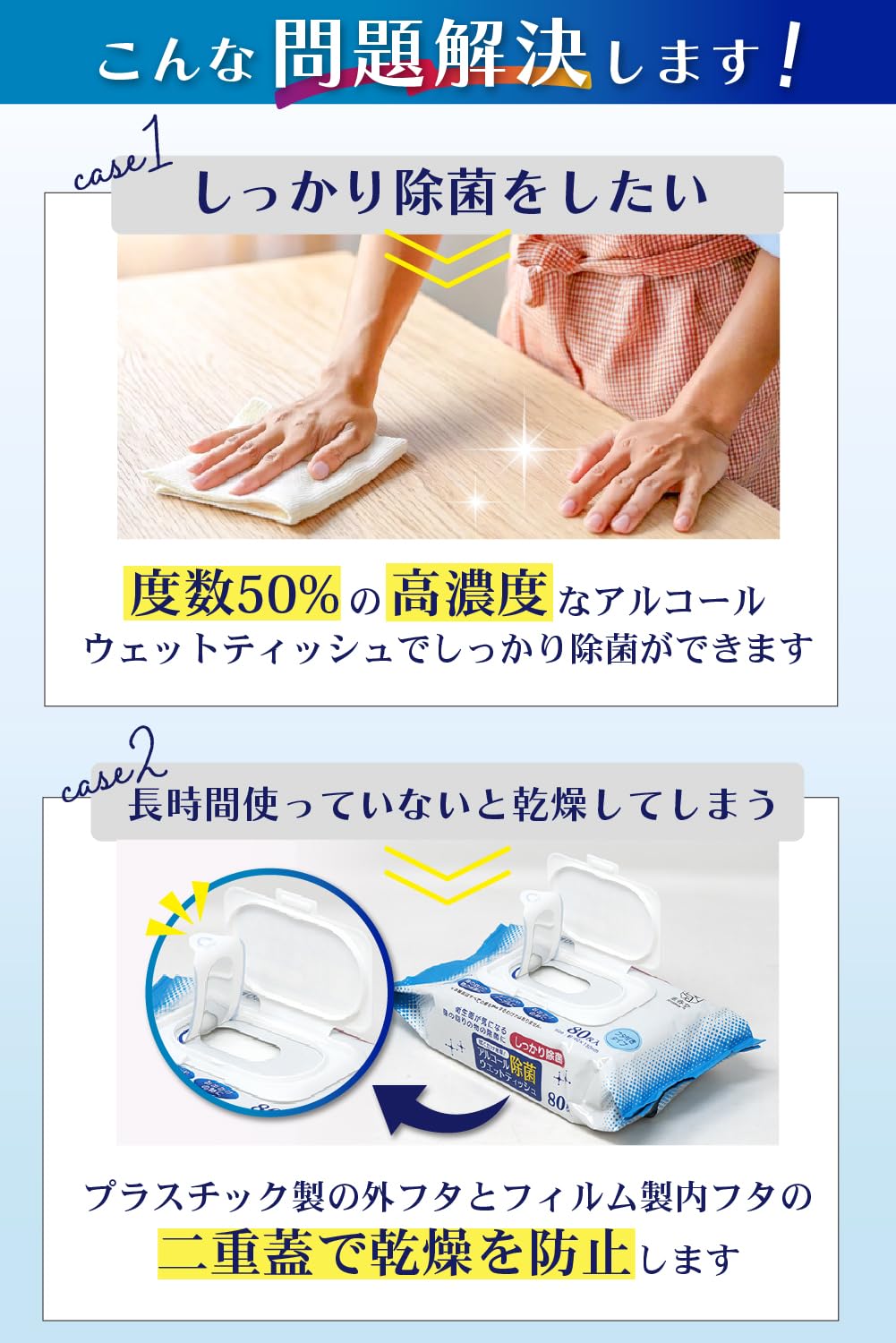 * 【利用シーン】手指の汚れ落とし、キッチンやテーブル、身の回りの除菌、お出かけの際などにも使用できるアルコール除菌ウエットティッシュです。