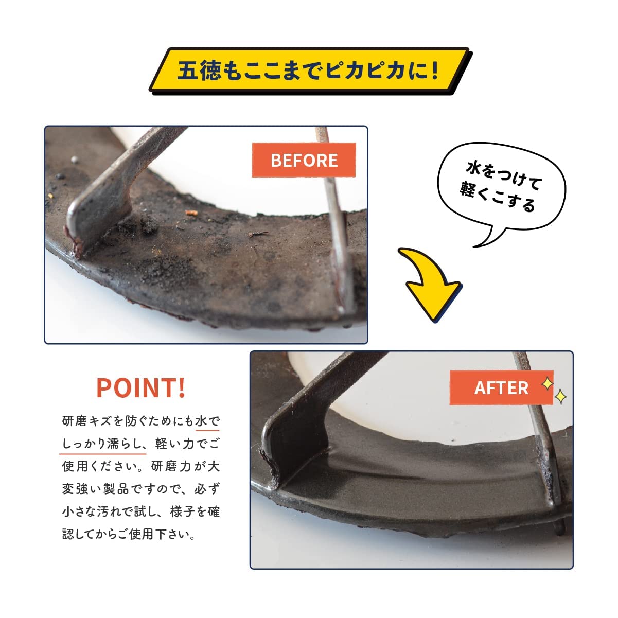 * 使用対象物の素材や使用する際の力の入れ方、水分量の不足により使用対象物に傷が入る可能性もございますので、 御使用の際は十分な水を使用し、まずは傷が入っても目立たぬところでお試し頂き自己責任において御使用ください。 弊社では使用対象物等の傷等の補償は一切致しかねます。ご了承ください。
