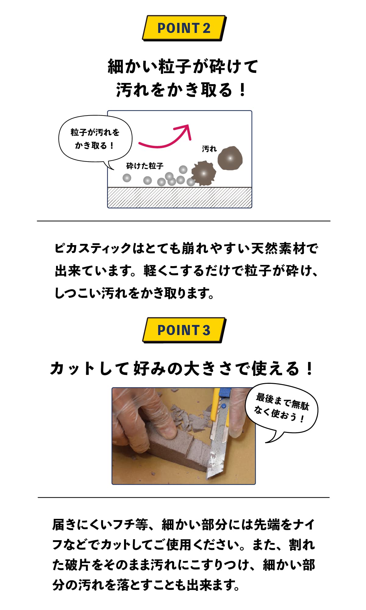 * トイレの便器に付くしつこい尿石や、バスルームの垢、スケールを危険な洗剤を使わずに、水にぬらしたピカスティックで軽く擦るだけで【安全に除去】できます。