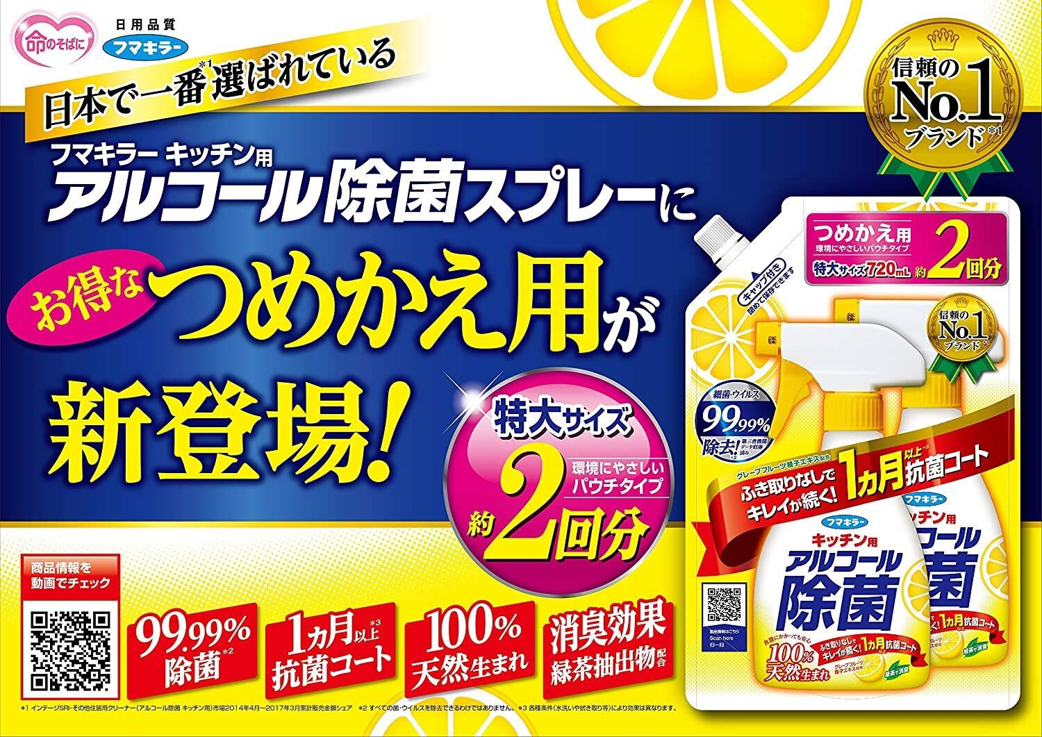 アルコール除菌 キッチン用アルコール除菌スプレー 詰め替え 720ml×3個 大容量 【食卓・調理台の除菌・消臭】 抗菌コートが1ヵ月持続 100%天然生まれ 【まとめ買い】