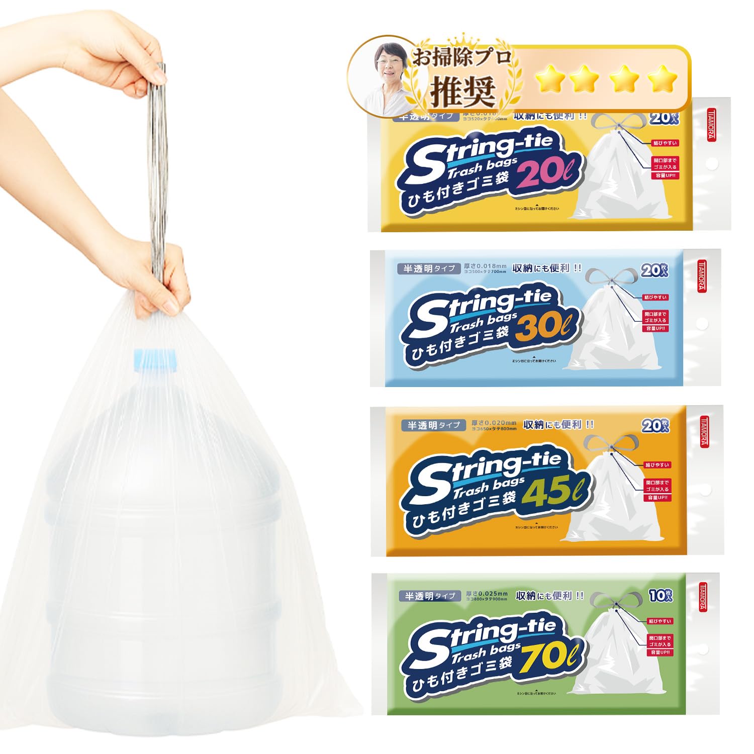 【20L・20枚】新時代のゴミ袋!!【ひも付きでラクラク結べる】厚手 大容量 20L 30L 45L 70L 取っ手付き ごみ袋 箱タイプ 半透明 乳白色 10枚入 20枚入 50枚入 100枚入 丈夫で破れにくい 便利収納BOX 家庭用・業務用 抗菌 防臭 (袋タイプ, 20L・20枚)