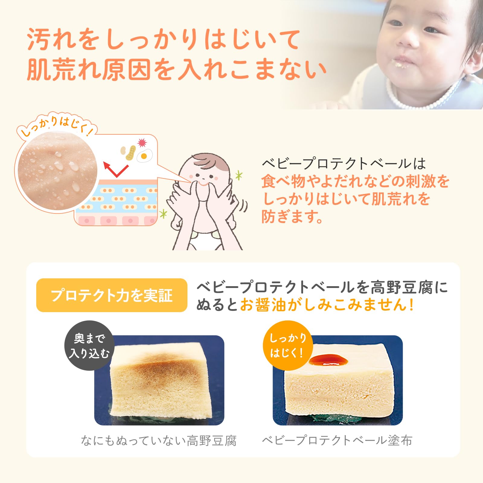 * 【ベビー&キッズのお口まわりをよだれや食べ物の刺激から守る】「ベビープロテクトベール」はお口まわりをベールで包み込み、よだれや食べ物の刺激から肌を守ります。水をはじく密着ベールなのに、洗浄料できちんと落とせて肌に負担をかけません。食事の前やよだれが多いときにつけてください。