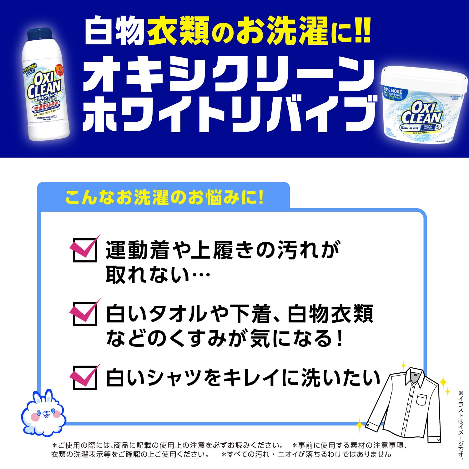 * 下着やワイシャツなどの白物衣類、ユニフォームやスポーツウェア、子供の運動着や上履き、さらには白い靴やスニーカーまで、幅広く使用できます。毎日の洗濯から特別なお手入れまで、オキシクリーン ホワイトリバイブがあなたの衣類を隅々までキレイにします。