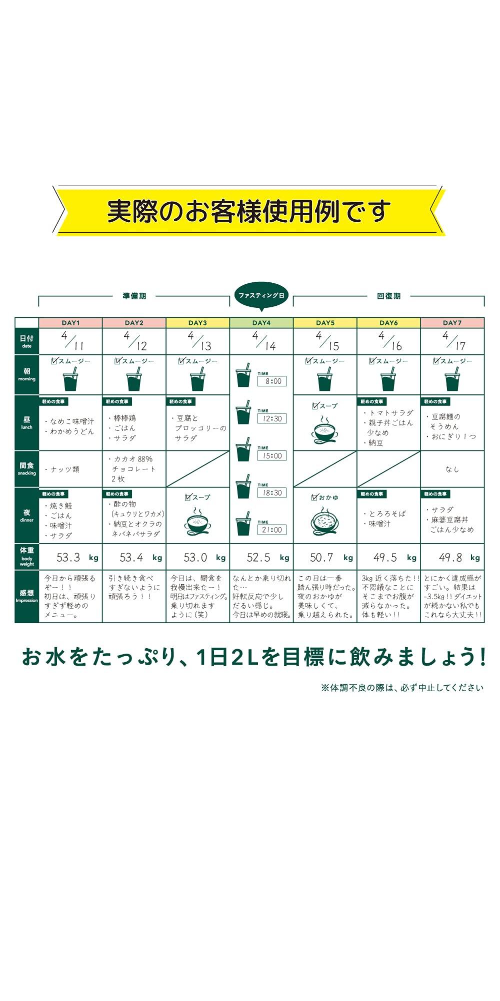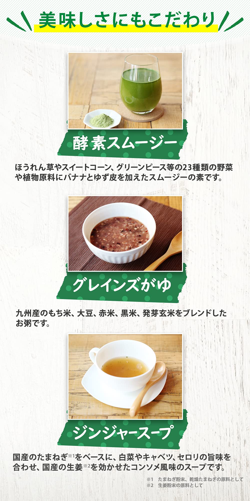 * 厳選された成分を1セットに凝縮:酵素スムージーは、ほうれん草やスイートコーン、グリーンピース等の23種類の野菜や植物原料にバナナとゆず皮を加えたスムージーの素です。ジンジャースープは、 国産のたまねぎをベースに、白菜やキャベツ、セロリの旨味を合わせ、国産の生姜を効かせ40種類以上の植物原料を使用した植物発酵エキスを配合したコンソメ風味のスープです。グレインズがゆは、九州産のもち米、大豆、赤米、黒米、発芽玄米をオリジナルブレンドし40種類以上の植物原料を使用した植物発酵エキスを配合したファスティング回復食用のお粥です。
