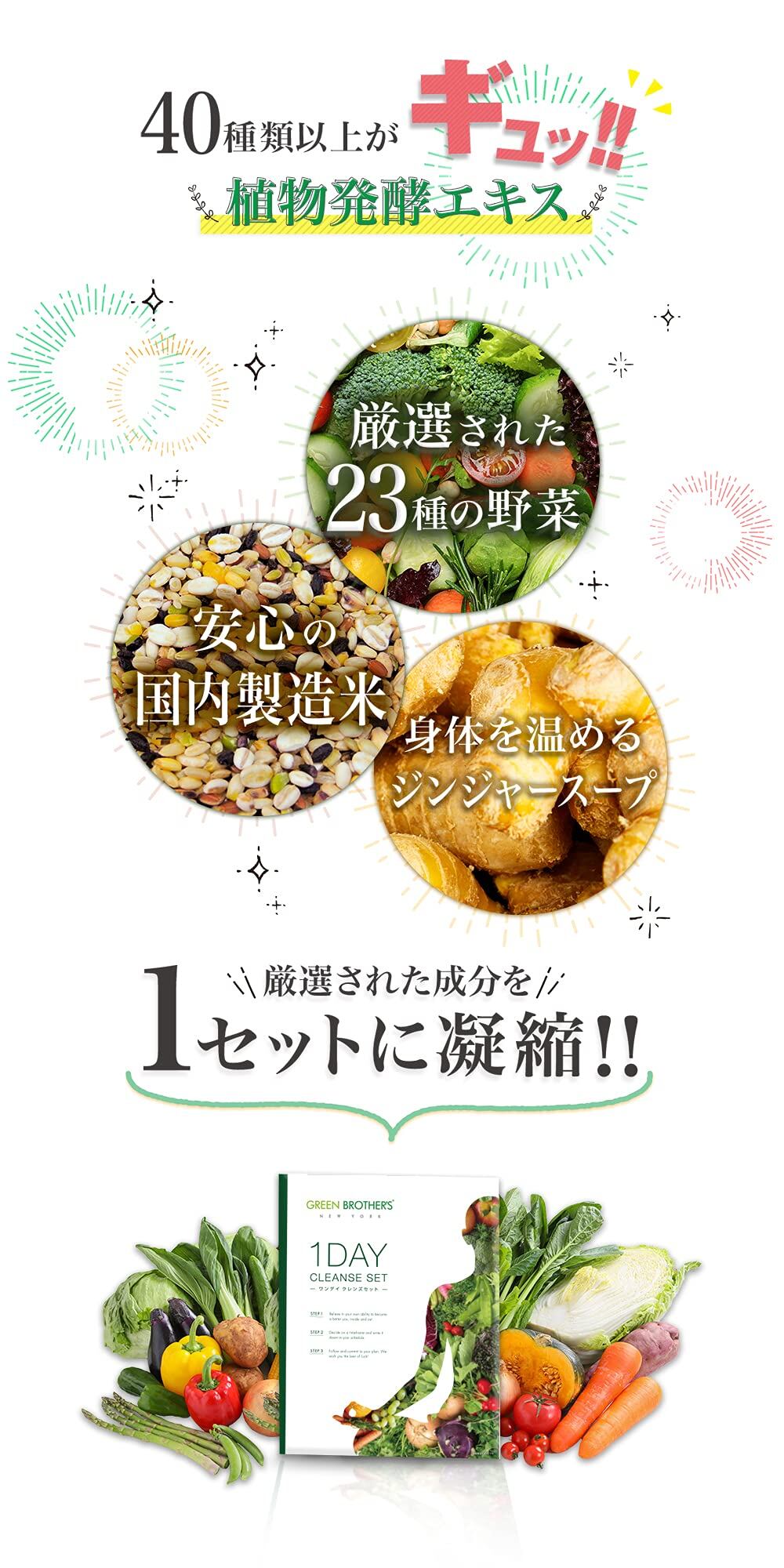 * 累計販売数100万セット突破(2025年10月20日時点)のGB 1DAY CLEANSE SET( グリーンブラザーズ ワンデイクレンズ セット )。新感覚のたった1週間のお手軽ファスティングダイエット。 ファスティングマイスターもおすすめ:ワンデイクレンズセットには、40種類以上の植物発酵エキスがぎっしりと詰まっているので、ダイエットに必要な酵素を効率的に摂取できます。ファスティングマイスターの管理栄養士もワンデイクレンズセットは、より多くの方に、気軽にファスティングに触れてもらうための商品としておすすめしています。