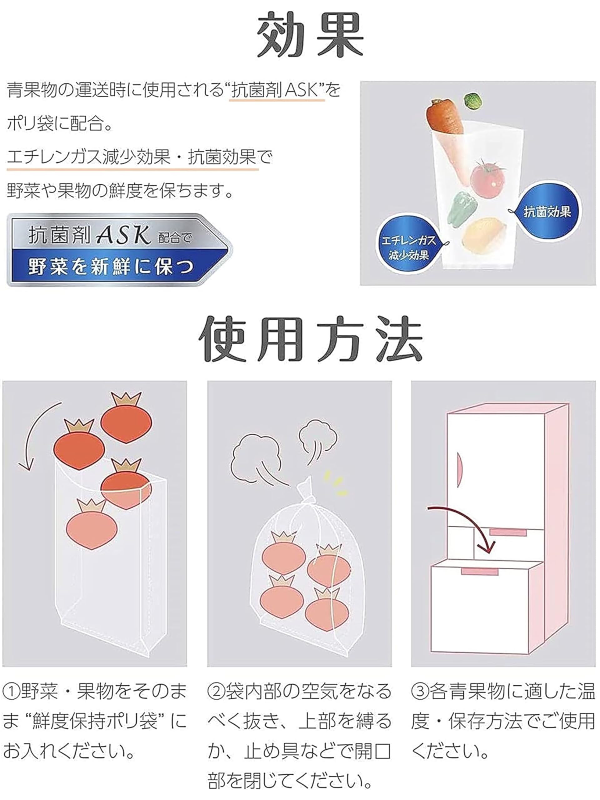 * 【鮮度 長持ち】抗菌剤を配合した野菜や果物の鮮度を保持するキッチンパックです。抗菌剤により野菜や果物から放出されるエチレンガスを減少、抗菌効果により鮮度を保持します。